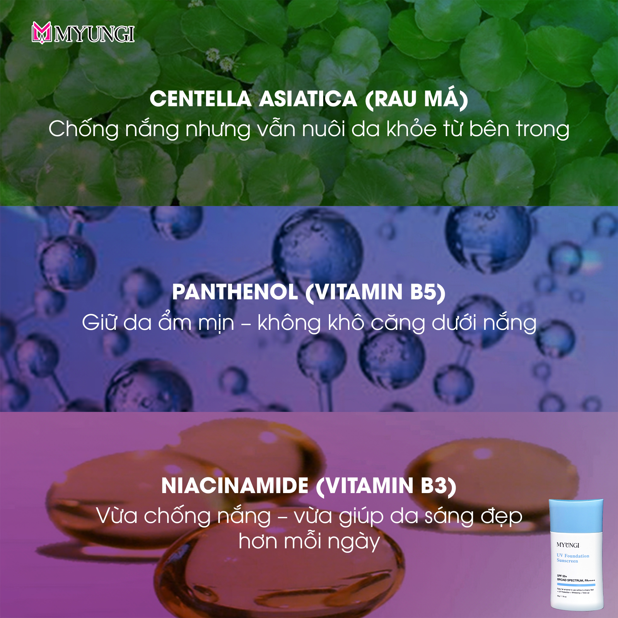 Kem chống nắng Myungi là dòng sunscreen lai (vật lý + hóa học) thế hệ mới, kết hợp hoàn hảo giữa bảo vệ da & làm đẹp da ngay tức thì.
